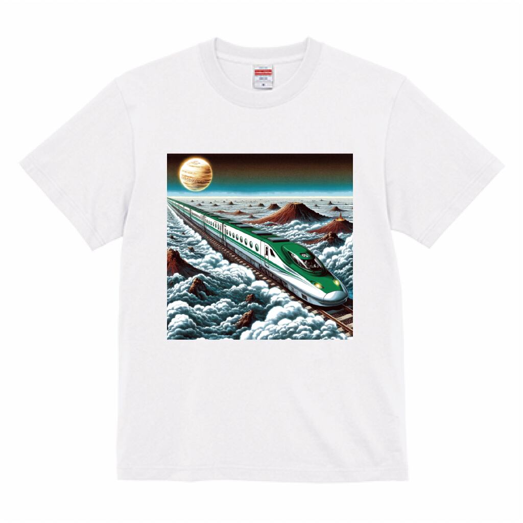 新幹線が宇宙を駆け巡る夢のようなデザインのTシャツです。